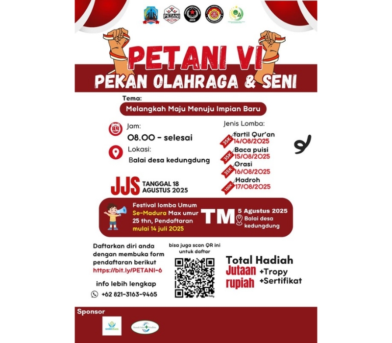 Di Madura, semangat itu diwujudkan lewat Pekan Olahraga dan Seni (PETANI) VI, sebuah festival tahunan yang digelar di Balai Desa Kedungdung. Dengan tema “Melangkah Maju Menuju Impian Baru”, kegiatan ini bukan sekadar perayaan agustusan, melainkan wadah silaturahmi dan ruang tampil bagi generasi muda se-Madura.