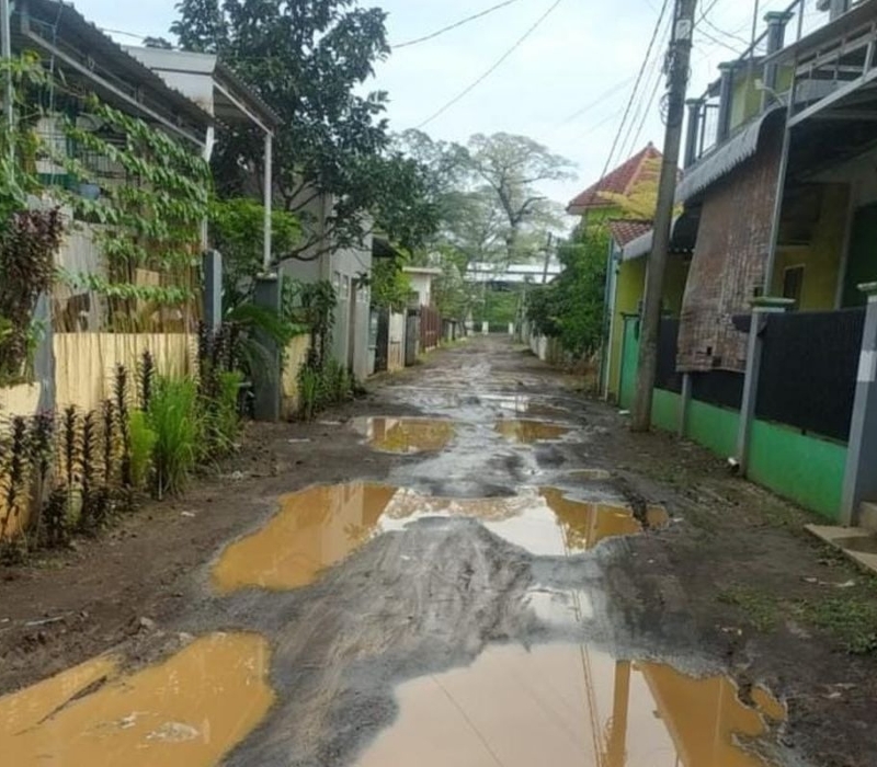 Di sejumlah titik, jalan perkampungan mengalami kerusakan cukup parah. Aspal terkelupas dan membentuk lubang-lubang besar yang dipenuhi air bercampur lumpur. Kondisi ini menghambat aktivitas warga, termasuk anak sekolah dan pekerja yang harus melintasi jalan tersebut setiap hari.