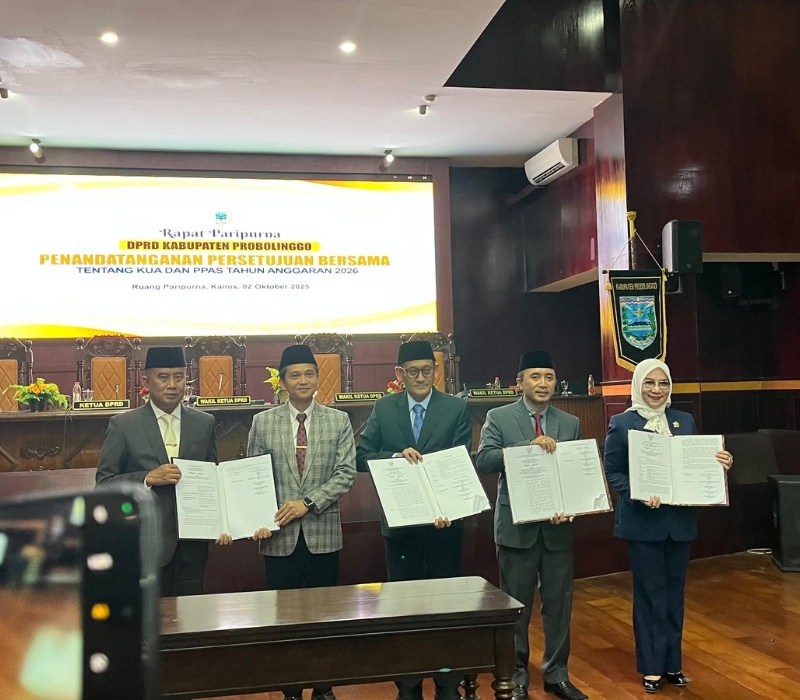 PILIHANRAKYAT.ID, Probolinggo-DPRD Kabupaten Probolinggo menggelar Rapat Paripurna dengan agenda Pandangan Akhir Fraksi serta Penandatanganan Persetujuan Bersama atas Kebijakan Umum Anggaran (KUA) dan Prioritas Plafon Anggaran Sementara (PPAS) Tahun Anggaran 2026, serta penetapan tiga Rancangan Peraturan Daerah (Raperda), Kamis (2/10/2025), di Ruang Paripurna DPRD Kabupaten Probolinggo.