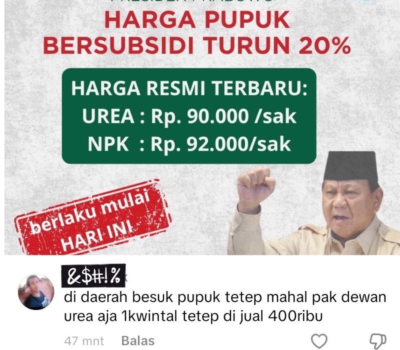 Video tersebut telah ditonton lebih dari 42 ribu kali dan menuai beragam tanggapan dengan lebih dari 200 komentar. Namun, di balik kabar baik itu, banyak warganet yang justru mengeluhkan bahwa harga pupuk di lapangan masih jauh di atas Harga Eceran Tertinggi (HET).