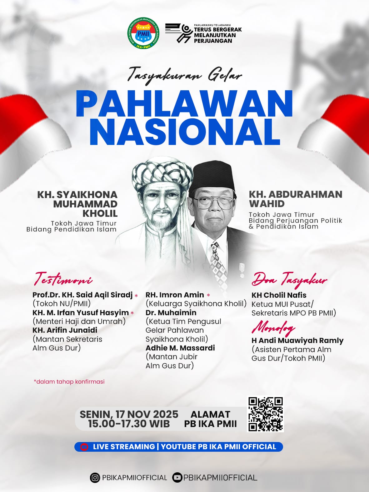 Turut bersyukur dan bangga dengan anugerah pahlawan bagi kedua nya, maka PB IKA PMII menggelar Tasyakuran Gelar Pahlawan Syaikhona Muhammad Kholil dan KH Abdurahman Wahid (Gus Dur) hari ini (senin 17/10) di kantornya dengan mengundang beberapa tokoh baik dari kalangan NU maupun eksternal dan pernah menjadi bagian dari saksi sejarah perjuangan kedua tokoh tersebut.