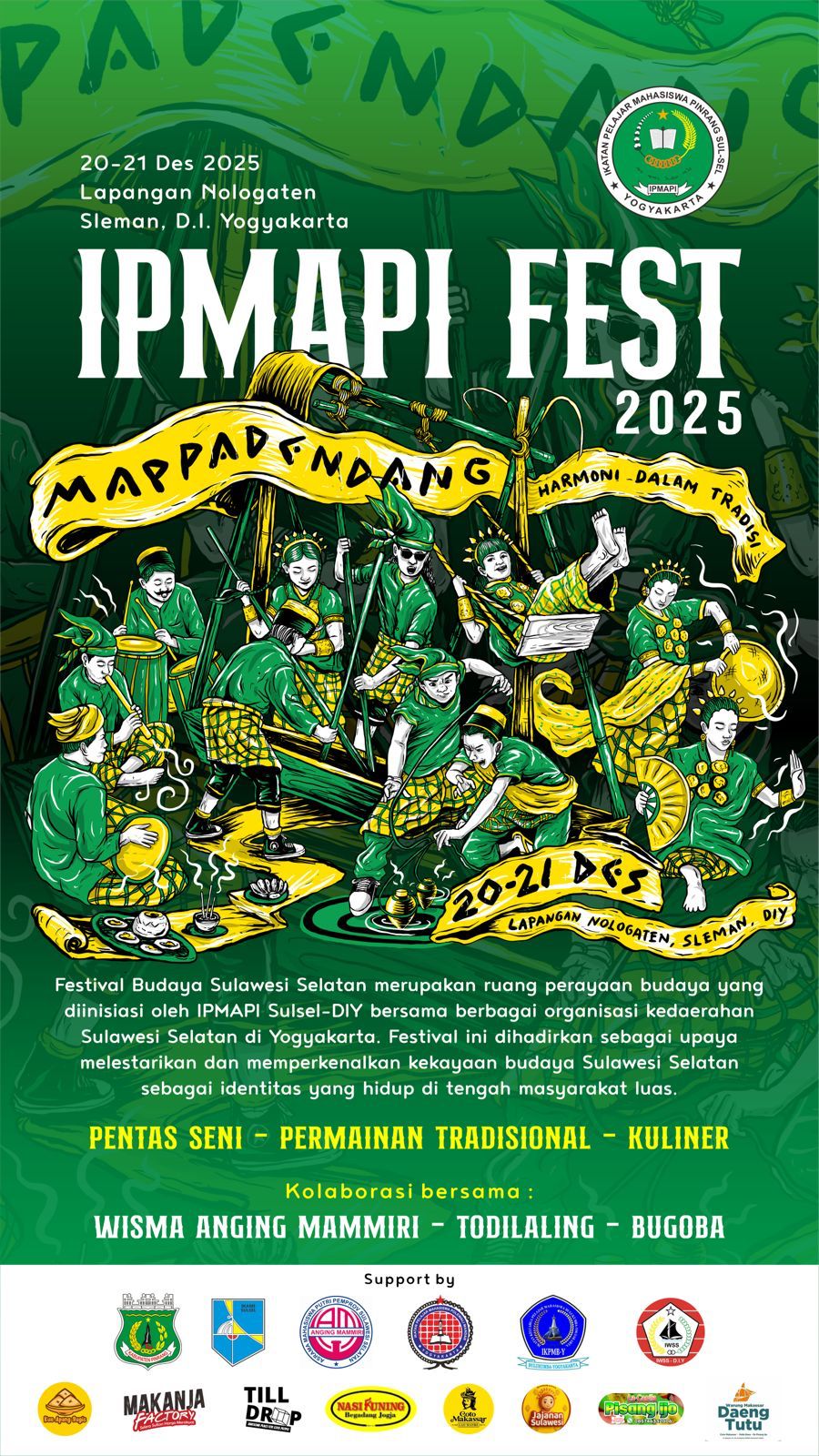 PILIHANRAKYAT.ID, Yogyakarta – Ikatan Pelajar Mahasiswa Pinrang (IPMAPI) Sulawesi Selatan–Daerah Istimewa Yogyakarta akan menyelenggarakan IPMAPI Festival 2025 dengan mengusung tema “Mappadendang; Harmoni dalam Tradisi”. Kegiatan ini dijadwalkan berlangsung selama dua hari, pada 20–21 Desember 2025, bertempat di Lapangan Nologaten, Yogyakarta.
