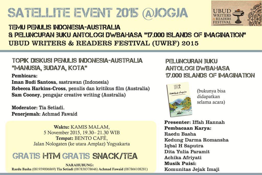 Hadiri dan ramaikan sebuah Event Sastra menarik bertajuk Satellite Event 2015 @Jogja: Temu Penulis Indonesia-Australia dengan tema diskusi “Manusia, Budaya, Kota” yang diikuti dengan acara Peluncuran Buku Antologi Dwibahasa “17.000 Islands of Imagination” Emerging of Ubud Writers & Readers Festival (UWRF). Event yang akan dihadiri oleh penyair-sastrawan Indonesia (Yogykarta) dan Australia (Malbourne) bertempat di BENTO CAFÉ, Jalan Nologaten (Utara Amplaz) Yogyakarta. Waktunya tepat pada hari Kamis, 5 November 2015 pukul 19.30– 21.30 WIB.