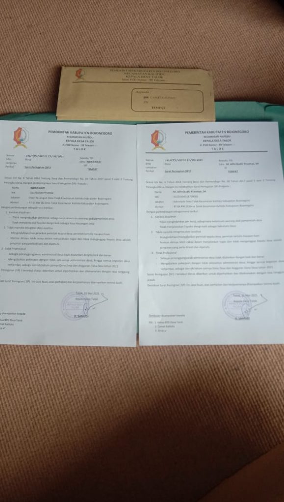 PILIHANRAKYAT.ID, Bojonegoro-Guna mewujudkan tata kelola pemerintahan desa yang mengedepankan optimalisasi pelayanan terhadap masyarakat dan guna meningkatkan ketaatan perangkat desa terhadap pimpinan, hari ini kades terbitkan SP 1. Pemdes Talok memang…
