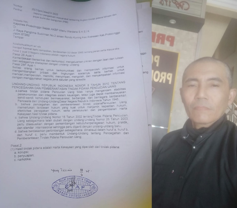 Laporan pengaduan tersebut dilayangkan kepada Kapolres Probolinggo AKBP Wisnu Wardana, S.H., S.I.K., melalui surat bernomor 017/lpm/abad/VI/2025. Dalam laporannya, Abu Nasik menyampaikan keresahan masyarakat atas dugaan penyalahgunaan dana PBB yang selama ini dinilai tidak transparan serta berpotensi merugikan masyarakat dan keuangan negara.